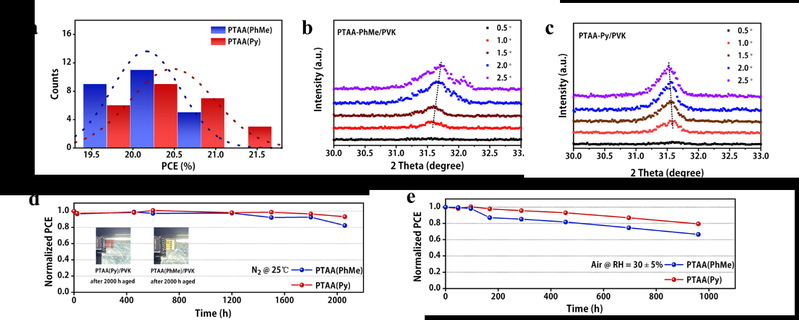 该团队发现,通过使用Py作为PTAA的溶剂,可以得到较传统溶剂更加均匀的PTAA薄膜;同时,由于Py较好的亲水特性,在低能耗制备工艺获得的前提下,良好的改善了PTAA薄膜表面的疏水性,有利于获得高质量的钙钛矿薄膜。此外,由于溶剂预埋的作用,使得生长在PTAA吡啶薄膜上的钙钛矿薄膜具有更低的应力,这有助于电池稳定性的提升(如图2)。最终,在以PEAI为界面修饰层后,将电池的PCE从20.53%提升至21.31%,溶剂预埋策略处理后的电池在氮气中老化2000小时后仍具有初始效率的93%,空气中老化约1000小时后仍具有初始效率的80%。
