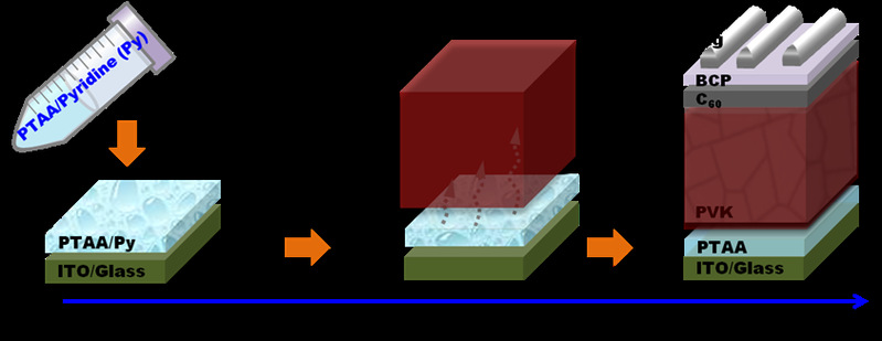 该团队以ITO/PTAA/Cs0.2FA0.8Pb(I0.95Br0.05)3/C60/BCP/Ag为基础,选择吡啶(Py)作为PTAA的溶剂,通过优化退火工艺,探索出低温(60℃)制备PTAA薄膜的工艺;同时,利用溶剂(Py)高沸点的特性,使得低温处理后的PTAA薄膜表面仍残留部分Py,鉴于Py的功能性作用(高亲水性及路易斯碱性),最终,成功制备得到溶剂预埋处理后的高性能钙钛矿太阳能电池(如图1所示)。