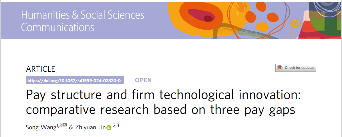 近日,我校人艺数法学院王松教授与经济学院合作,指导研究生林致远以杭电为第一单位在Nature子刊Humanities & Social Sciences Communications(SSCI一区)上发表了题为“Pay structure and firm technological innovation: comparative research based on three pay gaps”的研究论文(DOI: https://doi.org/10.1057/s41599-024-02820-0)。该论文的第一兼通讯作者是我校人文艺术与数字媒体学院教师王松,第二作者是我校经济学院硕士研究生林致远。