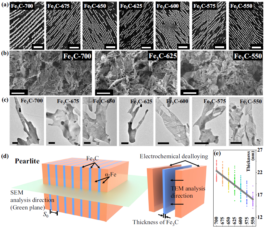 图2. 微结构表征。(a)共析钢在不同温度下等温淬火后的SEM图像,标尺为2 m。分别在不同温度下等温淬火后获得的Fe3C微米片(b)SEM图像和(c)TEM图像,标尺分别为10 m和1 m。(d)制备工艺示意图。(a)珠光体微结构及其电化学腐蚀去合金化示意图。(e)不同等温淬火温度下的Fe3C微米片厚度统计。