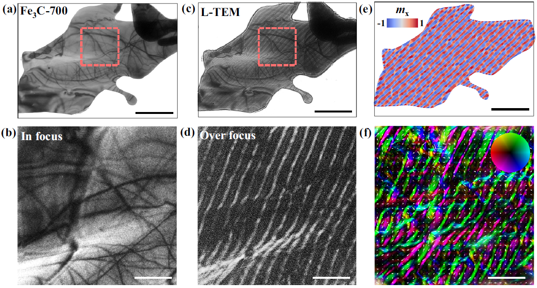 图4. 700℃等温淬火获得的Fe3C微米片的L-TEM表征。(a)正焦L-TEM图像和(b)红色框区域的局部放大图,标尺为500 nm。(c)过焦L-TEM图像和(d)红色框区域的局部放大图,标尺分别为2 m和500 nm。(e)微磁学模拟获得的磁化方向分布图,颜色表示x方向的磁化分量,标尺为2 m。(f)TIE方法获得的磁化方向分布图,颜色表示平面内磁化方向,标尺为500 nm。