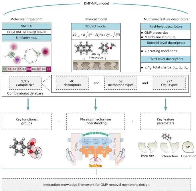 如图1所示,研究的第一步,是构建一个能真正理解分子与膜相互作用的“智慧大脑”。为此,团队将277种污染物、52种膜材料、2102组实验数据输入DMF-MRL模型,并引入了两大物理机制:尺寸筛分和电荷排斥效应。研究团队借此绘制出一张“互动知识图谱”,像是水处理领域的导航图,帮助我们少走弯路。