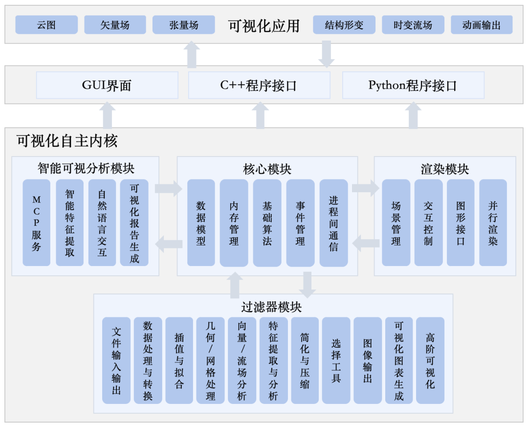 1. 核心模块、过滤器模块、渲染模块和智能可视分析模块共同构成内核系统。内核系统内部各模块通过接口机制协同工作,实现模块间的解耦与高效协作。GUI模块则为内核系统提供用户界面支持,承担与用户交互的功能。